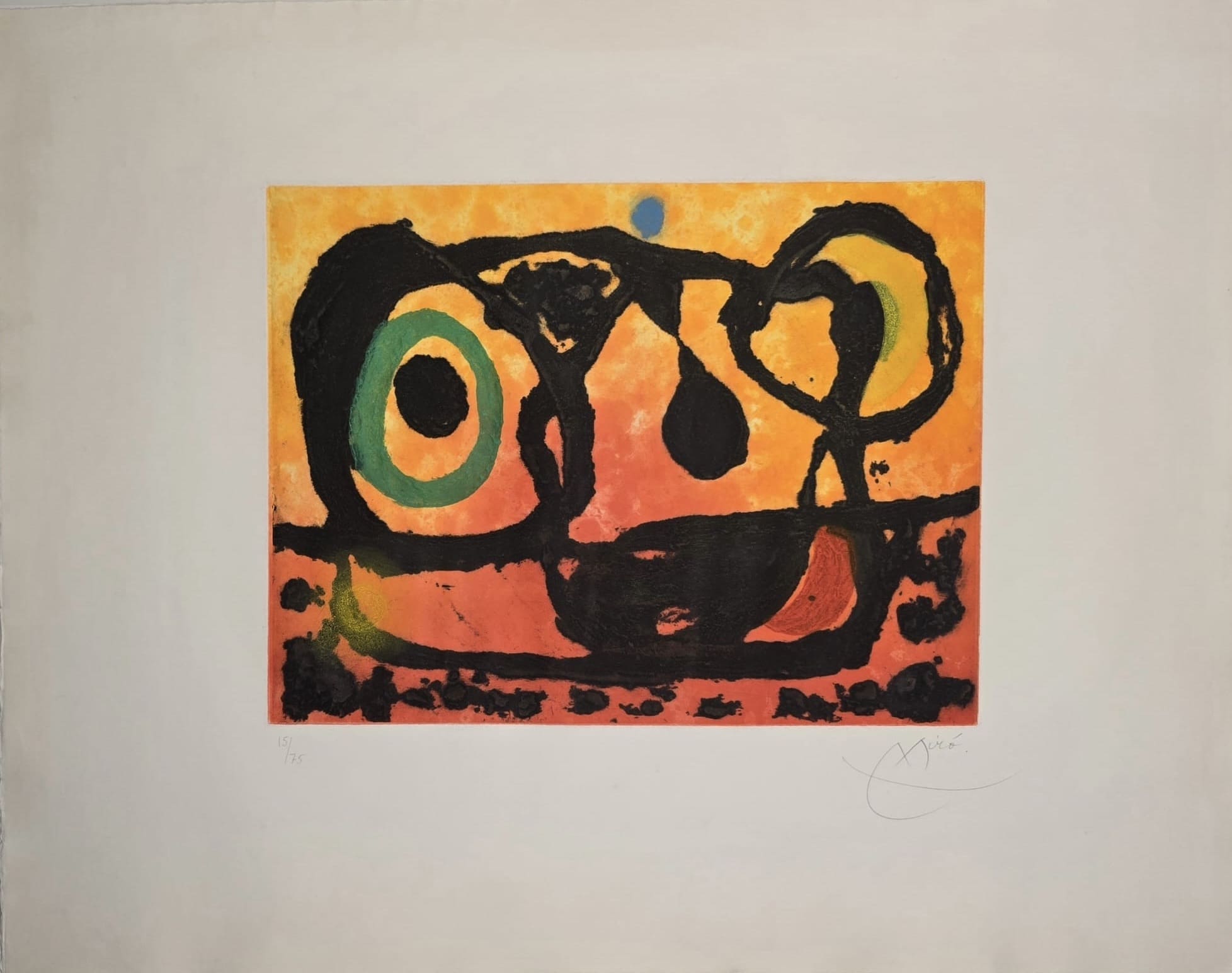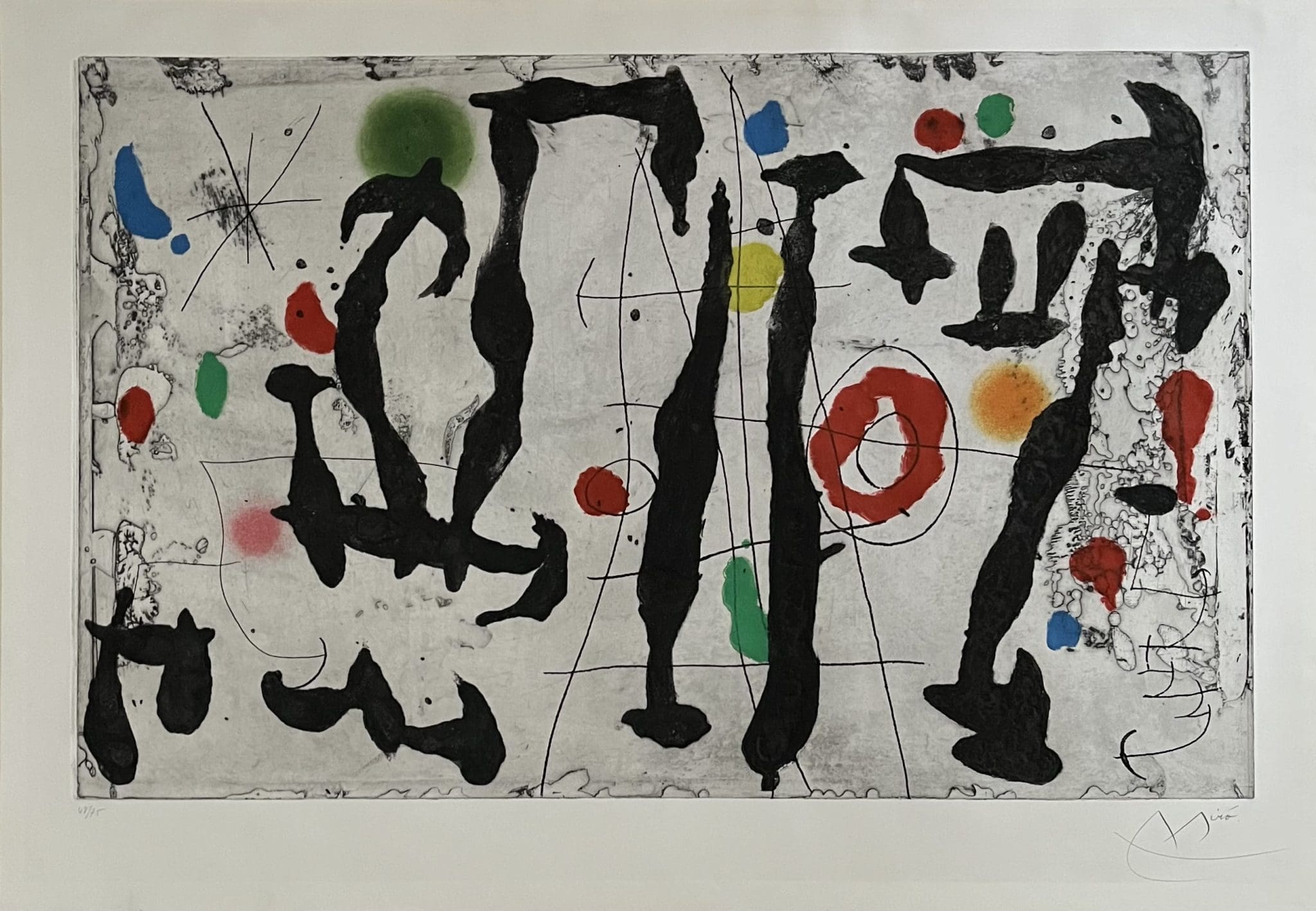 In 1948-49, although living in Barcelona, Joan Miró made frequent visits to Paris to work on printing techniques at the Mourlot Studios (lithographs) and at the Atelier Lacourière (engravings). A close relationship lasting forty years developed with the printer Fernand Mourlot and resulted in the production of over one thousand different lithographic editions.